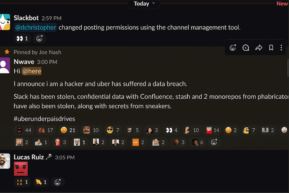 The hacker's message, posted in Uber's Slack channel, announcing the breach. Source: X