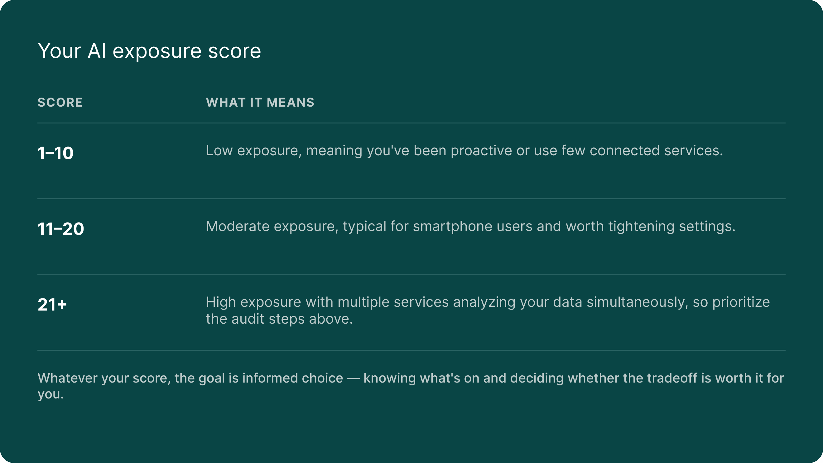 Start with the 30-minute audit in Section 6, then apply the 10-question framework from Section 8 to any new AI tool. The most impactful quick wins: disable AI training on your chatbots, turn off Gmail's Smart Features (both toggles), and check your phone's AI settings after every update.