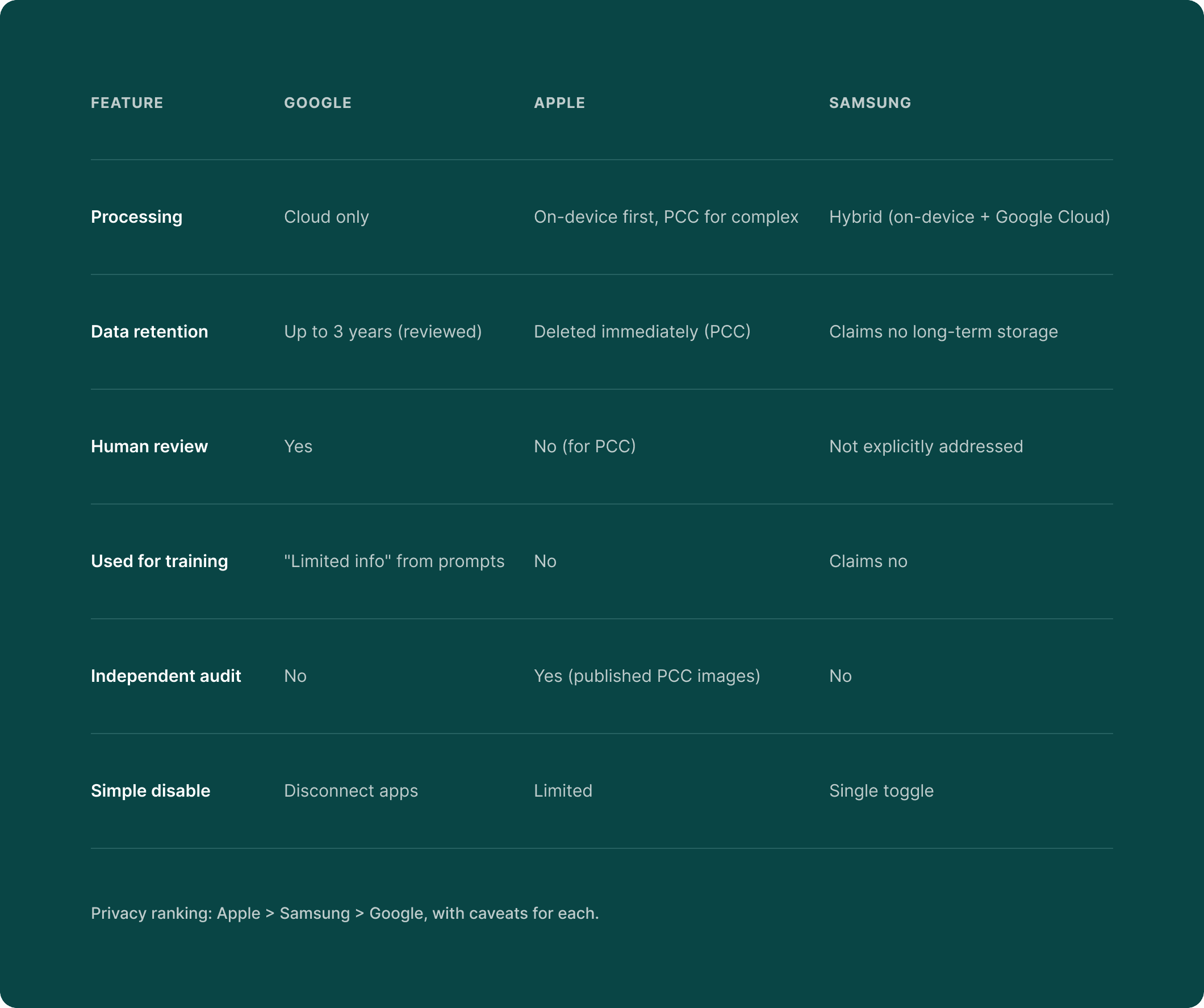 Comparison - How the platforms you already use (Google, Apple, and Samsung) handle your privacy differently.
